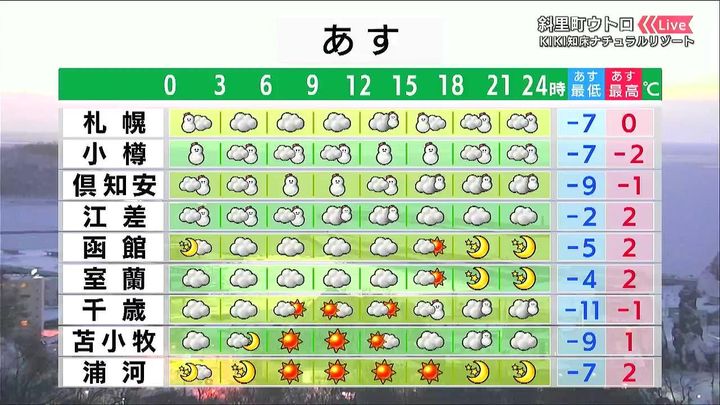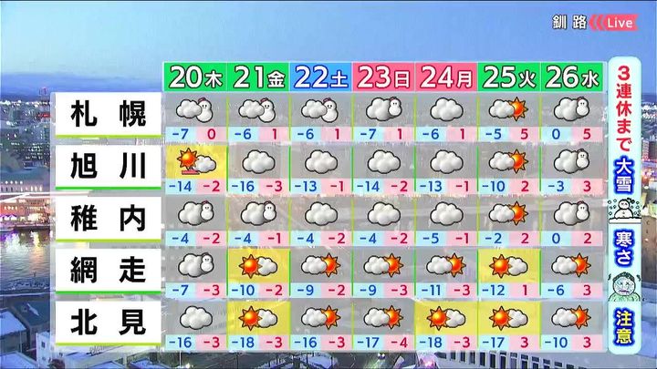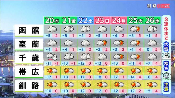 函館や千歳は雲が広がりやすく、土曜日は雪が強まるおそれがあります。道東は晴れますが、朝晩の冷え込みが強く、十勝地方では連日-20度くらいまで下がるところがありそうです。