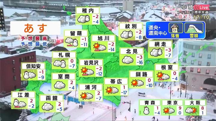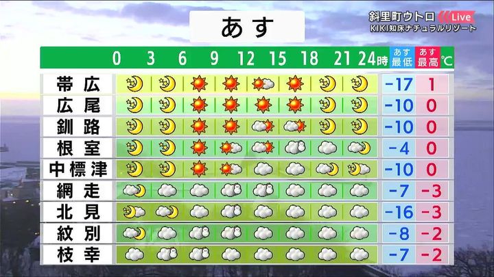 では、あす20日(木)の天気と気温です。日本海側やオホーツク海側の海岸部で雪が降るでしょう。あす朝は内陸で冷え込みが強まり、帯広は‐17度です。日中は0度前後です。