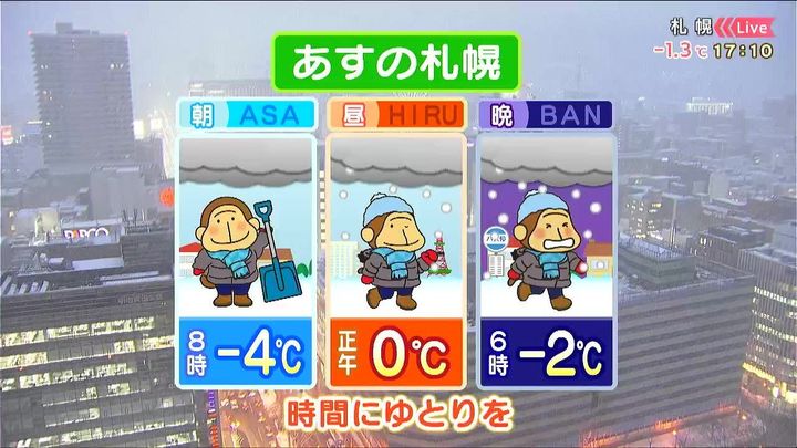 では、あすの札幌です!朝昼晩の天気をもんすけでお伝えします!
