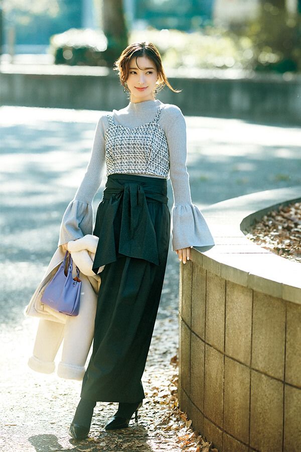 ニット¥9,790/Swingle(Swingle 有楽町マルイ店) ビスチェ¥11,000/MERCURYDUO(MERCURYDUO ルミネエスト新宿店) 手に持ったコート¥20,900/JILL by JILLSTUART スカート¥23,100/アルページュ ストーリー イヤリング¥9,020/イットアトリエ(14 SHOWROOM) バッグ¥40,700/ジャンニ キアリーニ(ジャンニ キアリーニ 銀座店) 靴¥12,980/RANDA