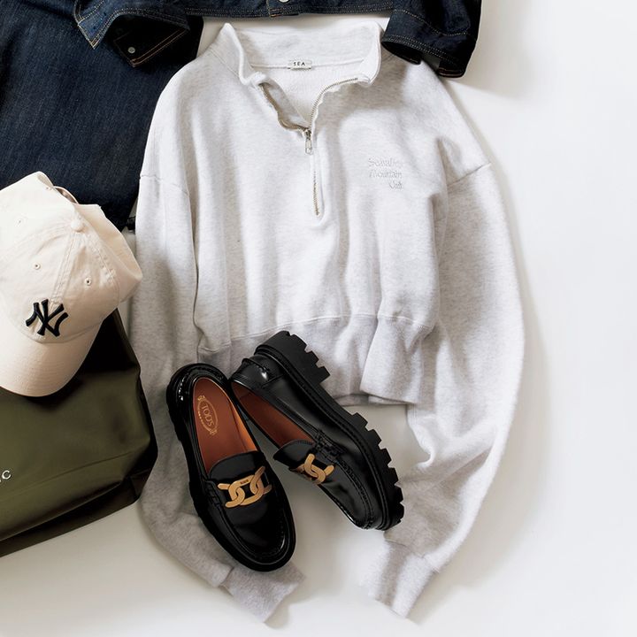 デニムやスウェットの日は、足元ローファーでバランスを。スニーカー並みに歩きやすくて、全身カジュアルな日も品よくまとまるトッズのローファーを愛用しています。シューズ[H3.5cm]¥127,600(トッズ/トッズ・ジャパン)※着用分は岡本さん私物