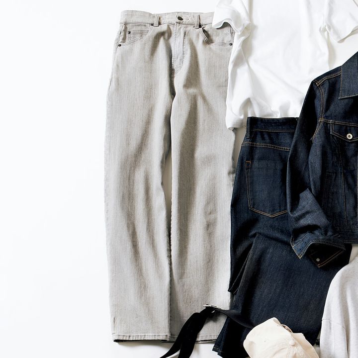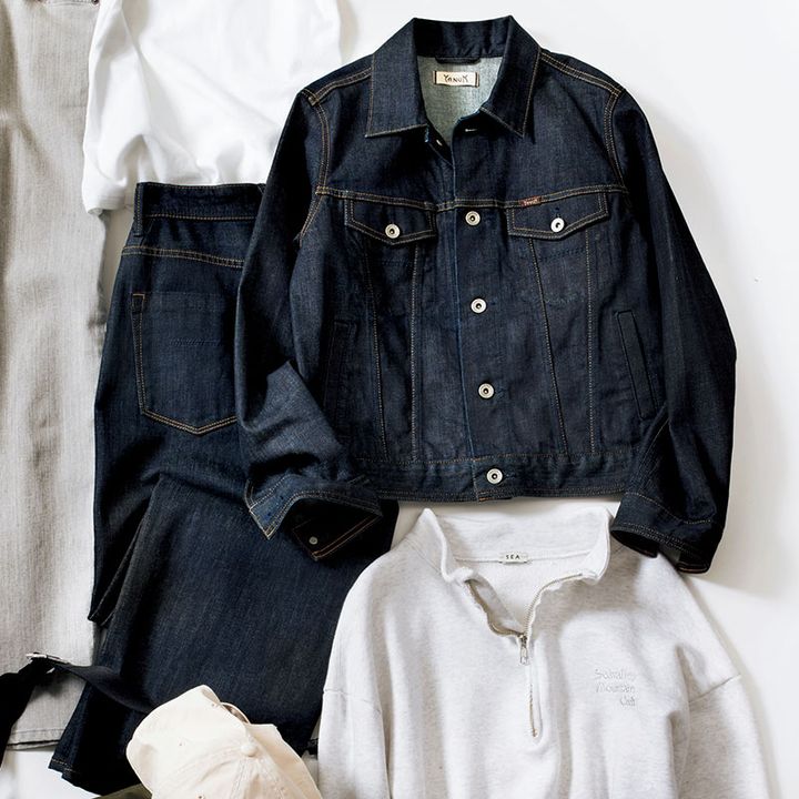 カジュアルすぎる?と思いきや、デニムのセットアップが使える!速攻で洒落て見えるし、柔らかいデニムを選んで動きやすさも担保!デニムジャケット¥33,000デニム¥26,400(ともにヤヌーク/カイタックインターナショナル)