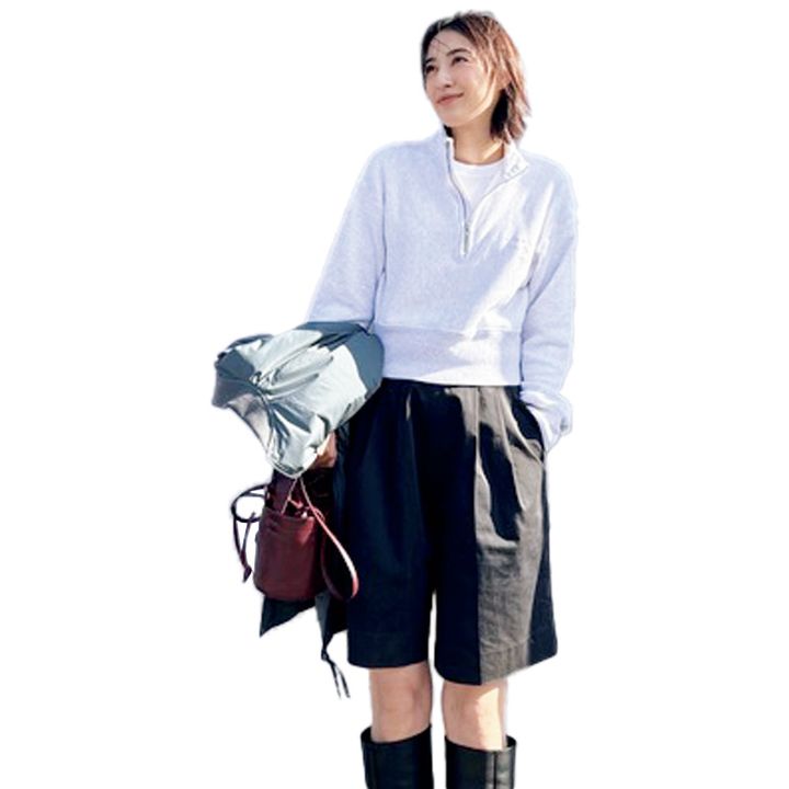トレンドのハーフジップスウェットもきれいめカジュアルに使いやすい!グレー、カーキ、オフホワイトを愛用。ワイドスラックスと合わせてハンサムに着るのが気分です。ハーフジップトップス¥30,800(SEA/エスストア)