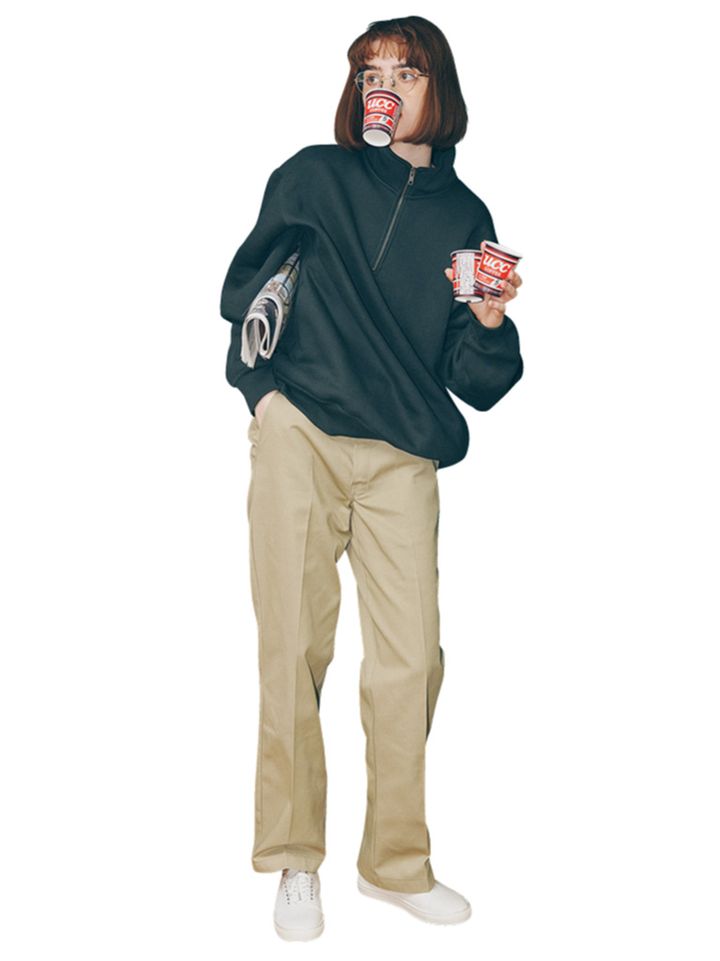 グリーンハーフジップスウェット/GU チノパンツ/ディッキーズ 眼鏡/ワンスリー コンパウンド フレーム(デュアル) スニーカー/YOAK(UTS PR)