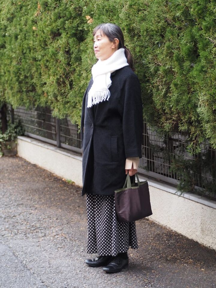 コートやスカート、シューズにいたるまで、長らく愛用している日常着で魅せるツートーンコーディネート。「昔の方がデザイン性がおもしろいアイテムが多かったような気がして、洋服を買う機会が減った気がします。このコートはもう何年も前に購入したものなのですが、フロント部分の留め具がボタンとファスナーの2パターンあって、シルエットの違いを楽しむことができるんです」