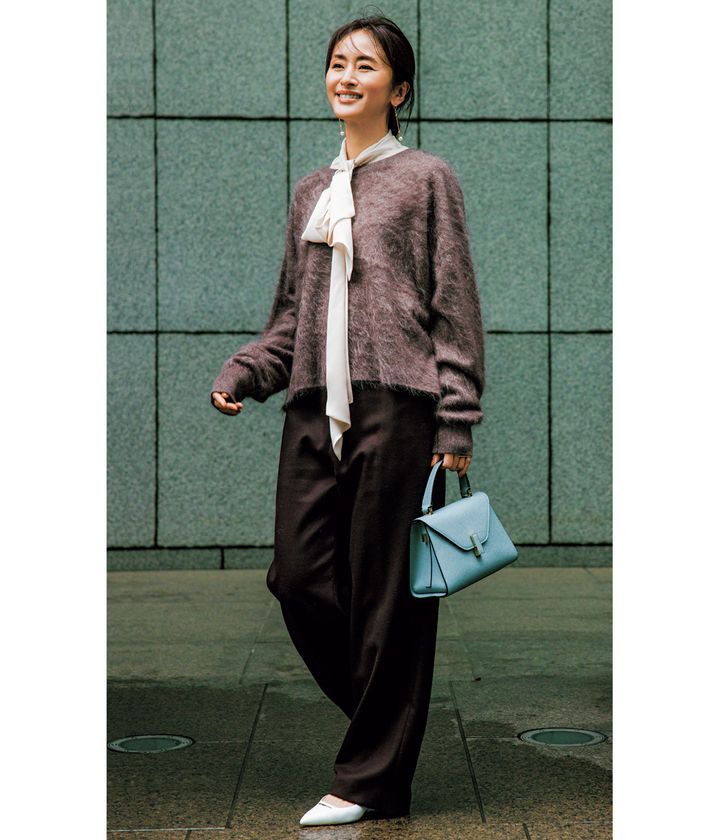 ニット¥69,300(カオス/カオス丸の内)ブラウス¥16,500(ノーブル/ノーブル 有楽町マルイ店)パンツ¥30,800(ニコラ ジェンソン/リノウン)バッグ¥572,000(ヴァレクストラ/ヴァレクストラ ジャパン)パンプス¥69,300(ペリーコ/アマン)ピアス¥9,900(ワンエーアールバイウノアエレ/ウノアエレ)リング¥97,900(リズリーク/ロードス)