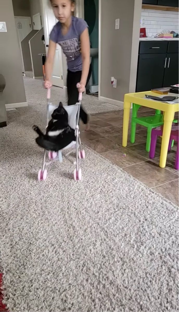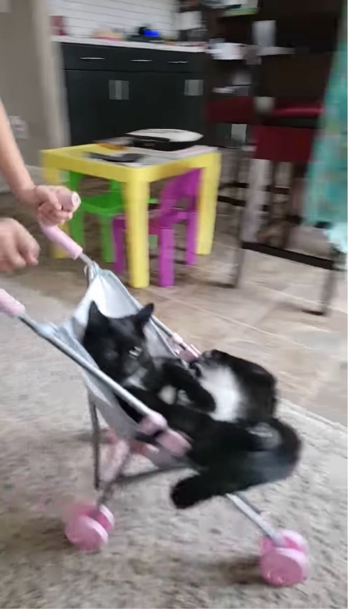 ベビーカーに乗せられたネコ。女の子のごっこ遊びに付き合ってあげている?【アメリカ・動画】