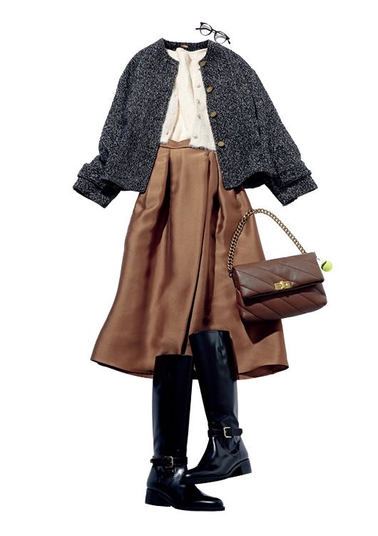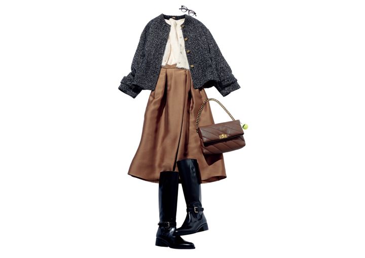 ふんわりスカート¥25,300/ジャスグリッティー ツイードセットアップ(ジャケット)¥44,000/アルページュストーリー シャギーアンサンブル¥11,990/NATURAL BEAUTY BASIC キルティングバッグ¥17,050、ロングブーツ¥39,600/ともにダイアナ(ダイアナ 銀座本店) メガネ¥12,000/OWNDAYS