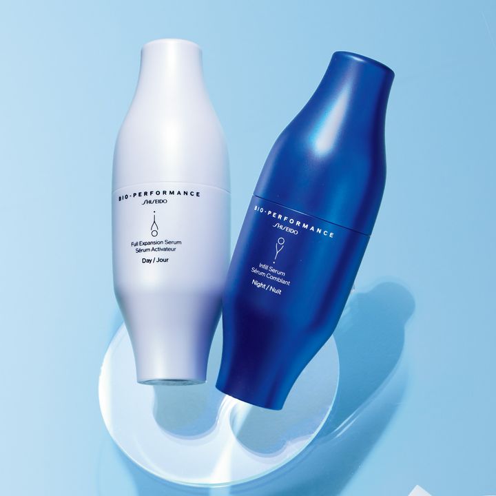 成分の分子サイズを調節。夜は小さくして浸透させ、朝は元に戻してふっくらと。(左)フルエクスパンション セラム〈朝用美容液〉(右)インフィルセラム〈夜用美容液〉各30ml ¥35,200(SHISEIDO)