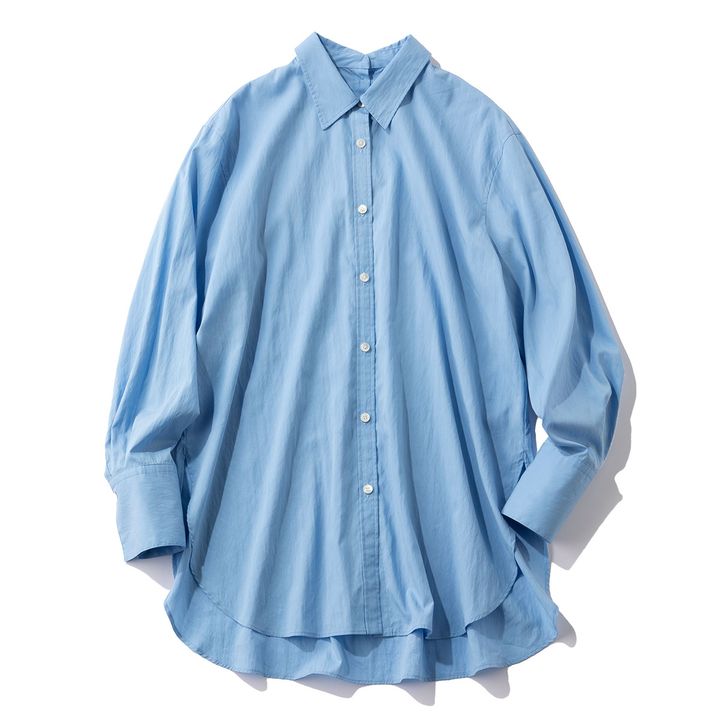 Iラインシルエットの細見え黒コーデは「差し色ブルーシャツ」で今っぽさも!