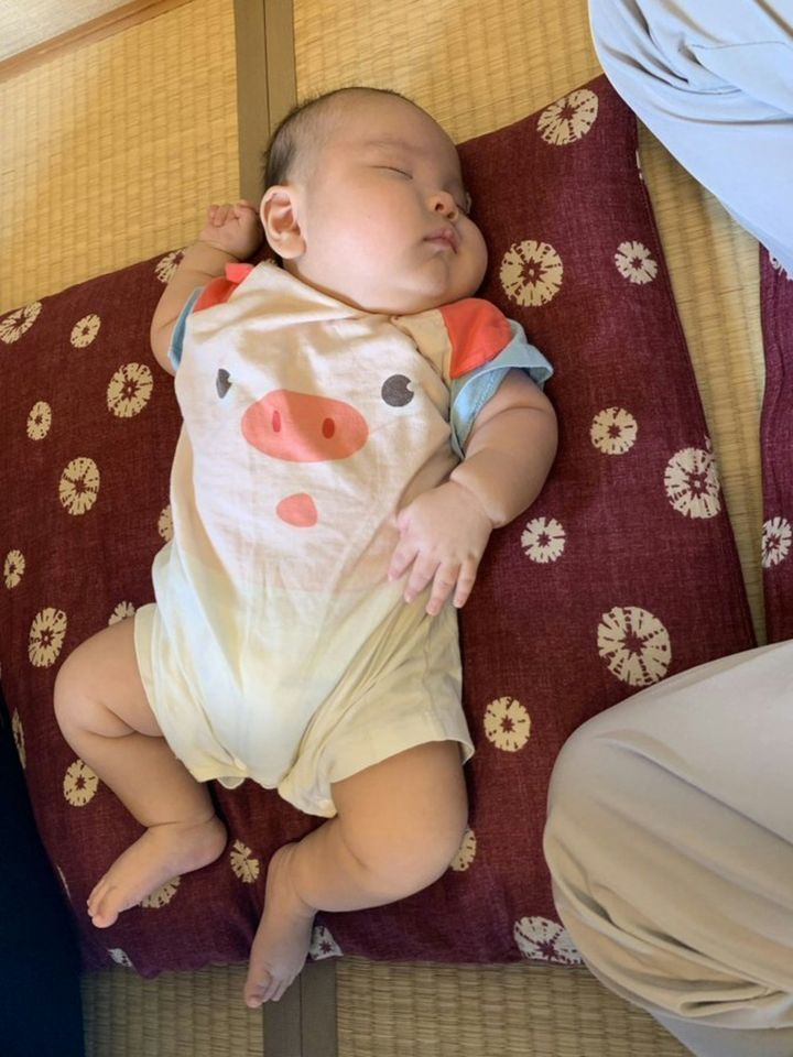 ぷくぷくしたほっぺが、まるでお餅のよう。ほっぺだけでなく手足もムチムチしていて、赤ちゃんならではのかわいい姿に癒やされます。この投稿には「赤ちゃんのほっぺは国宝級」「手足もたまらんです~」「座布団に納まるサイズ感がまたいい」などのリプライが寄せられていました。