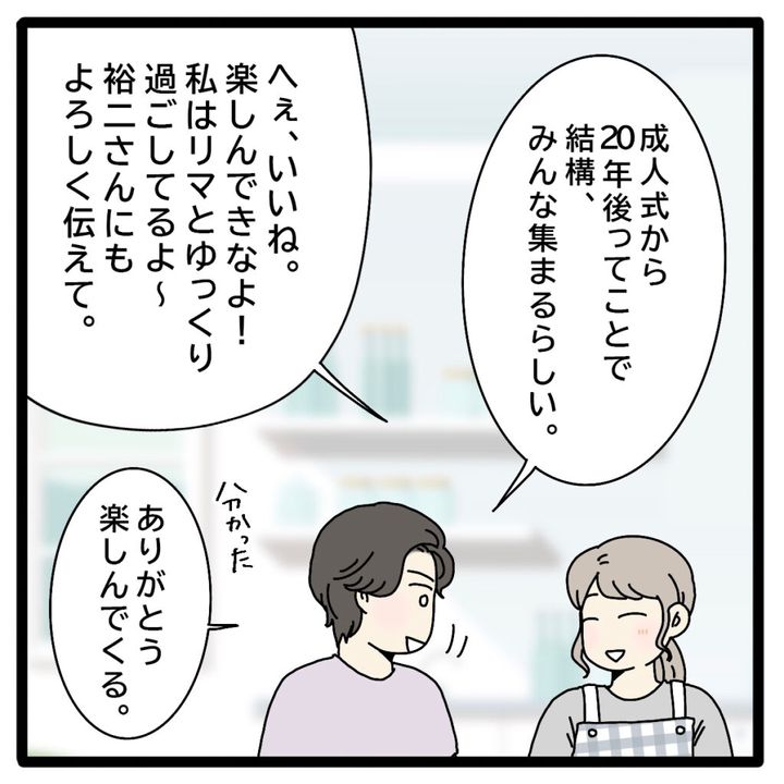 同窓会に行くから、と実家に帰ると聞いた理恵さんに、「成人式から20年後ってことで、けっこうみんな集まるらしい」と言う正志さん、「へぇ、いいね。楽しんできなよ!私はリマとゆっくり過ごしてるよ~。裕二さんにもよろしく伝えて」と了承する理恵さんに、「わかった。ありがとう。楽しんでくる」と言いました。