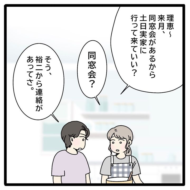 そしてある日のこと、「理恵~、来月同窓会があるから土日実家に行って来ていい?」突然同窓会のことを話す正志さんに驚き「同窓会?」と聞き返す理恵さんに、「そう、裕二から連絡があってさ」と同窓会の詳細を話し始めました。