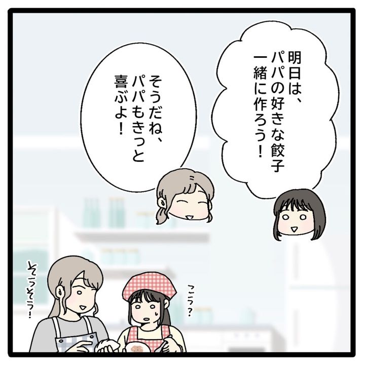そして、「明日は、パパの好きな餃子一緒に作ろう!」リマちゃんがうれしそうに言うのを聞いて、「そうだね、パパもきっと喜ぶよ!」理恵さんも笑顔になりました。