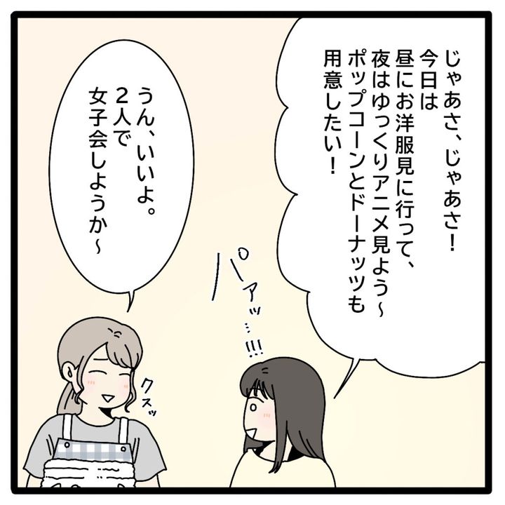 すると、「じゃあさ、じゃあさ!今日はお洋服見に行って、夜はゆっくりアニメ見よう~!ポップコーンとドーナツも用意したい!」声を弾ませてそう言うリマちゃんを見て、「うん、いいよ。2人で女子会しようか~」微笑ましく思いながらそう答えました。