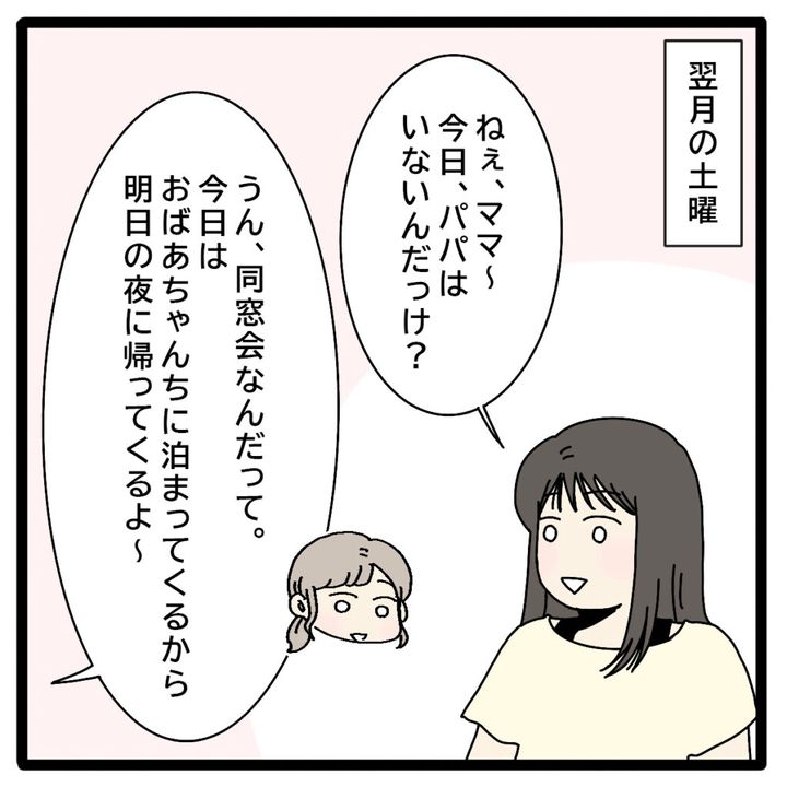 そして翌月土曜日のこと。「ねぇ、ママ~。今日パパはいないんだっけ?」リマちゃんにたずねられた理恵さんは「うん、同窓会なんだって。今日はおばあちゃんちに泊まってくるから。明日の夜に帰ってくるよ~」と答えました。