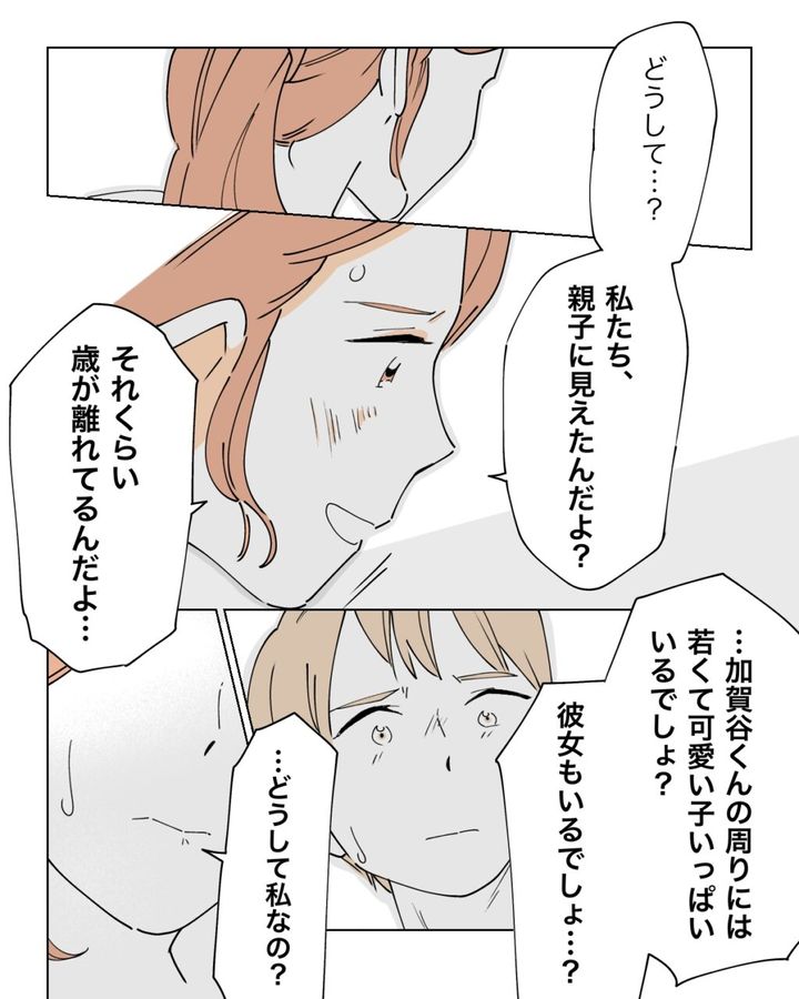 「私達、親子に見えたんだよ?それくらい年が離れてるんだよ・・・」どうして説明しなくちゃいけないの?「加賀谷くんの周りには若くて可愛い子いっぱいいるでしょ?彼女もいるでしょ?どうして私なの?」