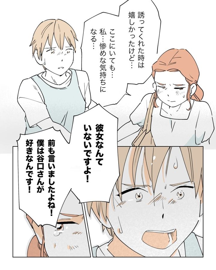 「誘ってくれた時は嬉しかったけど・・・ここにいても・・・私、惨めな気持ちになる。」素直な気持ちを加賀谷君に伝えました。それでも加賀谷くんは「彼女なんていないですよ!前にも言いましたよね!僕は谷口さんが好きなんです!」真剣に、嘘なんて言っていないのは加賀谷くんの表情を見ればわかりました。