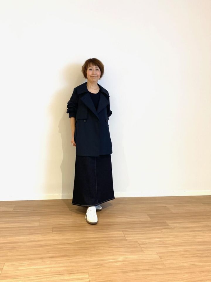 同じスカートで、トップスをネイビーの「リラクシーショートトレンチコート」にチェンジ。スカートと色のトーンを合わせることで、低身長さんに嬉しい縦長効果も!