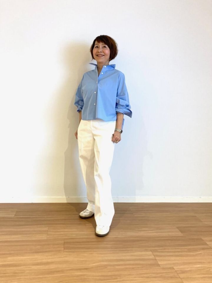 タイプライタークロップドシャツ(BLUE)¥ 9,990、テックチノストレートパンツ(WHITE)¥13,000/プラステ