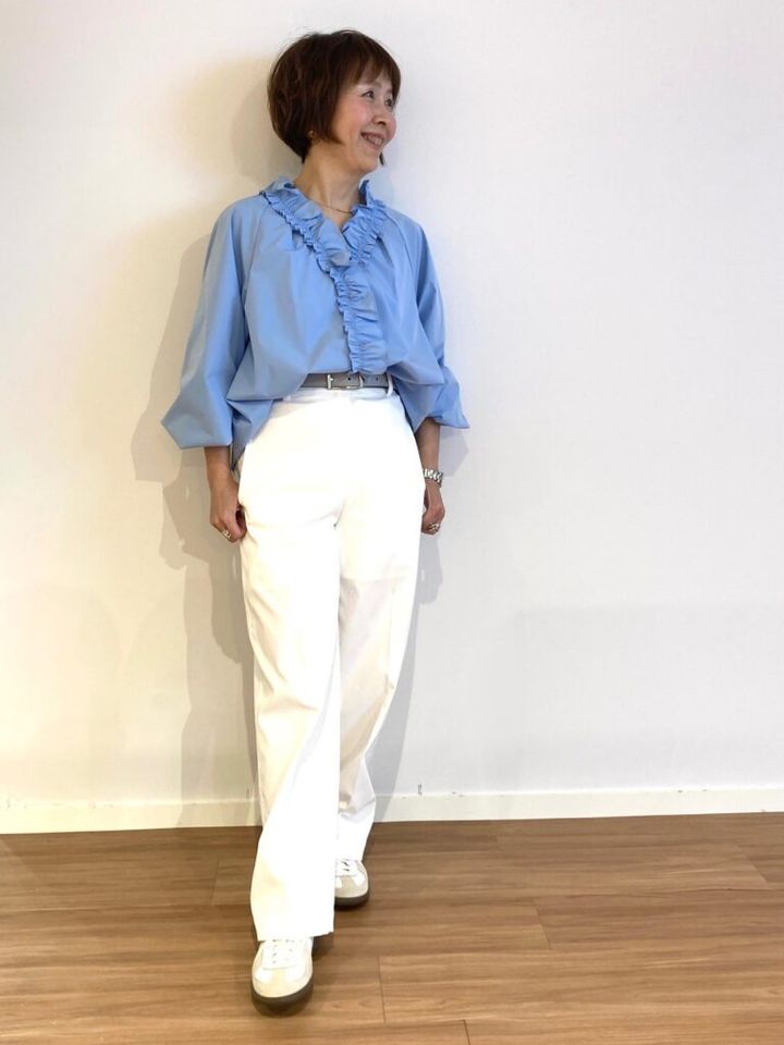 タイプライターフリルブラウス(BLUE)¥ 11,000、テックチノストレートパンツ(WHITE)¥13,000/プラステ