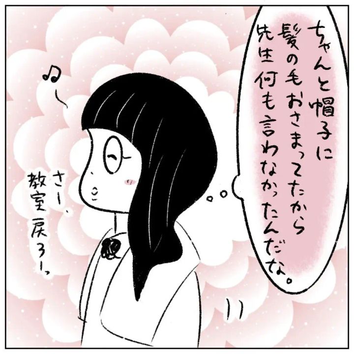「ちゃんと帽子に髪の毛おさまってたから先生何も言わなかったんだな」とルンルンで教室に戻るまるさん。