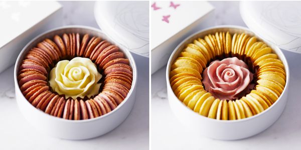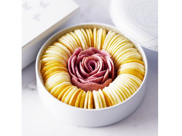 北海道産の生クリームを使用し、なめらかな食感に仕上げたミルキーでやさしい甘みのラングドシャ。バラの花をモチーフに一枚一枚丁寧に詰め合わせています。バニラとベリー、2種のフレーバーが楽しめます。
