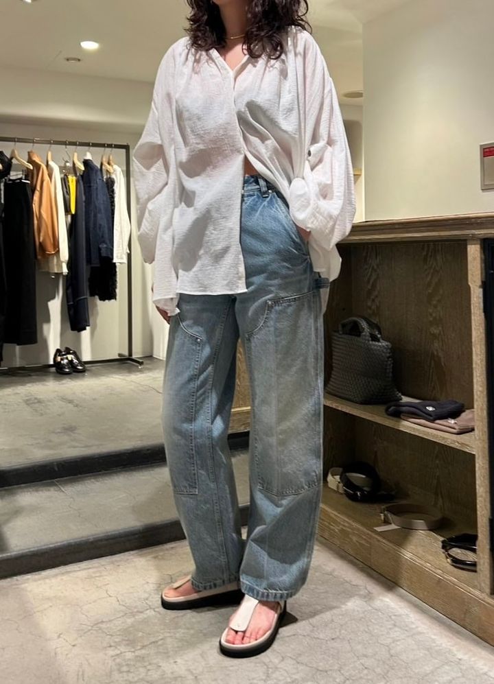 シャツ¥18,700(ガリャルダガランテ)、 デニム¥37,400(ピース)、 サンダル¥19,800(ニーテンナナイチハチ)