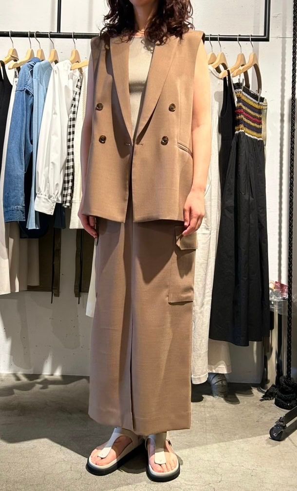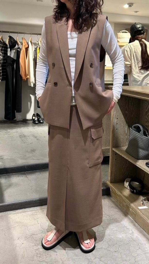 一番のポイントは、落ち感が美しい上質な素材であること。動きを加えたときも品よく揺れ、オトナの余裕も感じさせました。それでいてジャケットは袖のないベスト仕様になっているのでヌケ感があり、キマリすぎることもありませんでした。スカートがタイトなのも好み♡ 休日はもちろん、お仕事にも活躍しそうですよね。ベスト、スカート共に単品使いしやすそうなところも高ポイント。コーディネートの幅が広がりそうです。