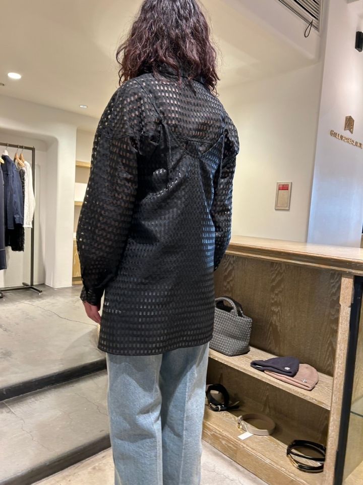 【ガリャルダガランテ】の展示会場には、一足お先に春夏アイテムに身を包んだ素敵なスタッフの方がたくさんいたのですが、なかでも気になったのがプレス前田路子さんの着こなし。このシャツ&キャミソールの白バージョンのレイヤードを実践していたのですが、すっごくおしゃれだったんです。なので、筆者も試してみたくて、白を着用していた前田さんとは色違いの黒で試着。