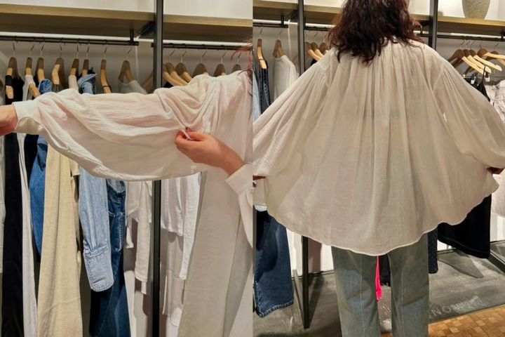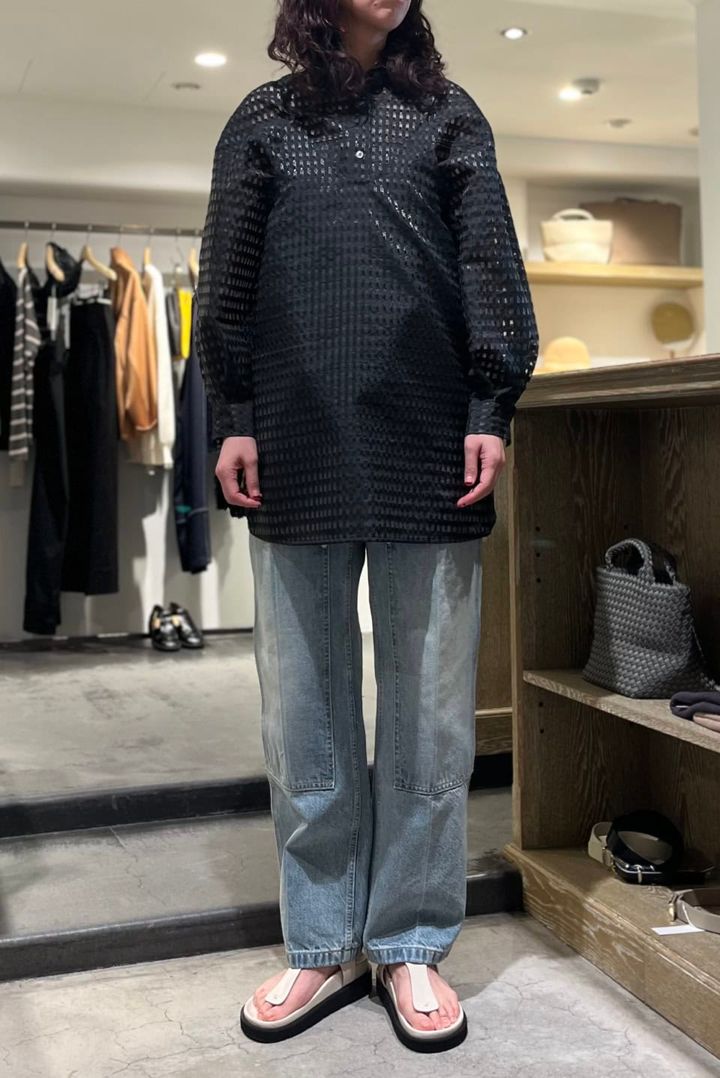 そんな中、プレスの方が「絶対に似合う! 」とオススメしてくれたこちらのブラウス。かなりふんわりとしたシルエットなので、着る前まで「私のこと、ぜんぜん分かってくれない(涙)! 」と心の中で思っていました。だって、絶対に大きく見えそう。しかし着てみるとぜんぜん大きく見えず、なんなら落ち感の美しい生地のおかげで、ちょっと華奢見えすらしている気が……。プレスの方って、プロって、やっぱりスゴイ。透け感もほどよく、ブラ1枚でもいやらしく見えないのもかなり優秀。夏でもシャツとからだの間に風が通りますし、汗をかいても肌にハリつかなそう。暑い季節でも快適な着心地が味わえること請け合いで……これは買うべき!