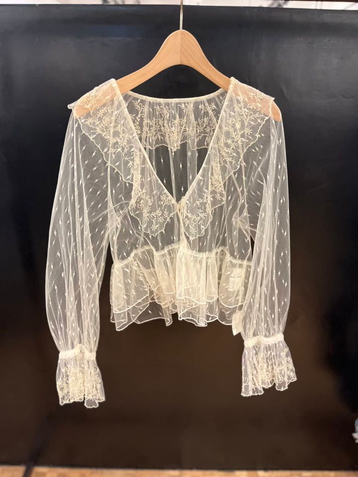 まずご紹介したいのが、繊細なレースが素敵なブラウス。襟つきなのでかなり甘くなりそうですが、透け感&深めのVネックのおかげで大人も取り入れやすくなっているんです。あと、ウエストの切り替えが高めなので視覚的なスタイルアップ効果もありますし、これはワードローブにあると重宝しそう! インナーにキャミソールやベアトップで透け感を楽しみながら、ボトムスは味のあるデニムでカジュアルダウンさせたスタイリングを楽しみたいかも。