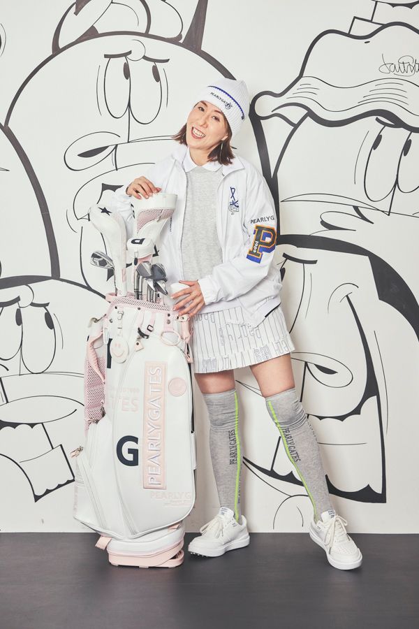 ブルゾン ¥49,500、ポロシャツ¥22,000、トレーナー¥33,000、スカート ¥31,900、ニット帽 ¥9,900、ニーハイソックス ¥4,180、キャディバッグ ¥70,400、ヘッドカバー(DR)¥8,800 (FW)¥8,580 (UT)¥8,360 (PT)8,140、靴¥39,600(全てPEARLY GATES)