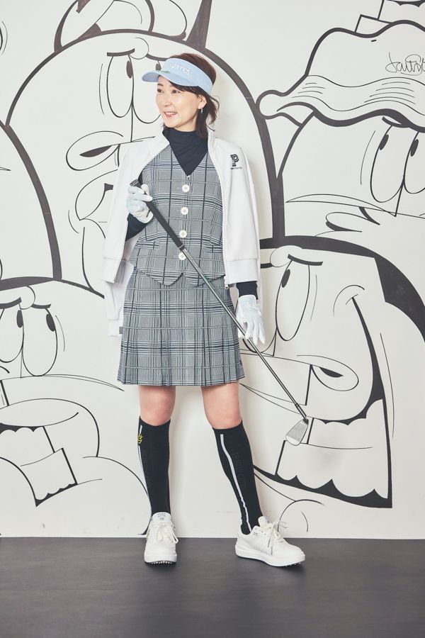 ブルゾン ¥35,200、ハイネック¥17,600、ベスト¥33,000、スカート¥31,900、サンバイザー¥7,040、ハイソックス¥3,740、グローブ(両手)¥13,200、靴¥39,600(全てPEARLY GATES)