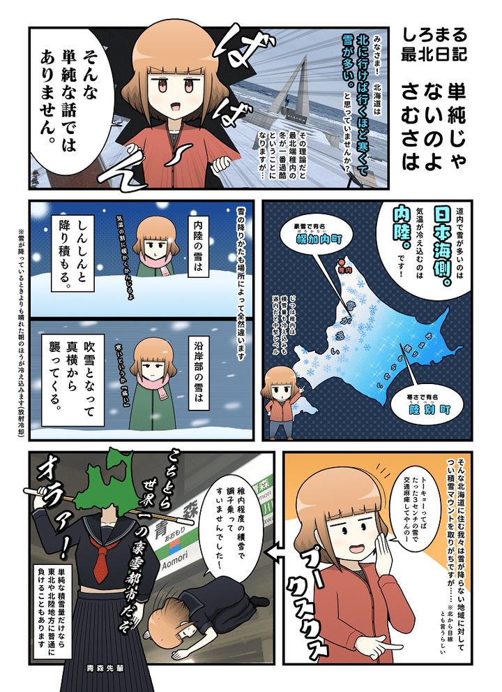 「北に行けば行くほど寒い」「雪が多い=寒い」ってウソ?ホント?北海道の冬事情|しろまる最北日記vol,49【漫画】