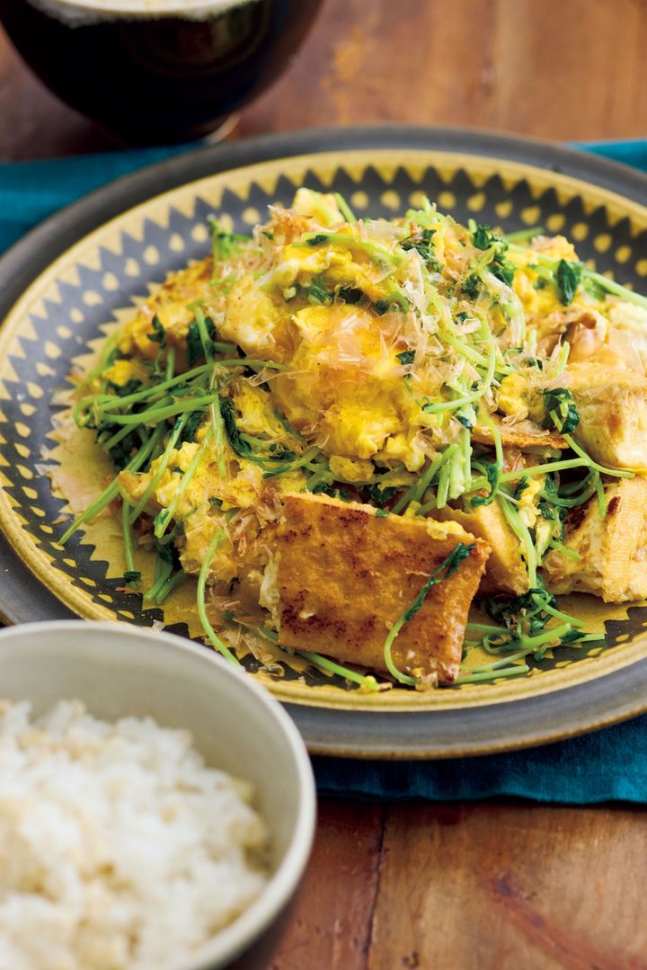 フライパンにごま油大さじ1/2を中火で熱し、厚揚げを大きめの一口大にちぎりながら入れて炒める。薄く焼き色がついたら豆苗を加えて炒め、しんなりしたら塩、しょうゆ各小さじ1/3と削り節2パック(約6g)を加えて混ぜる。