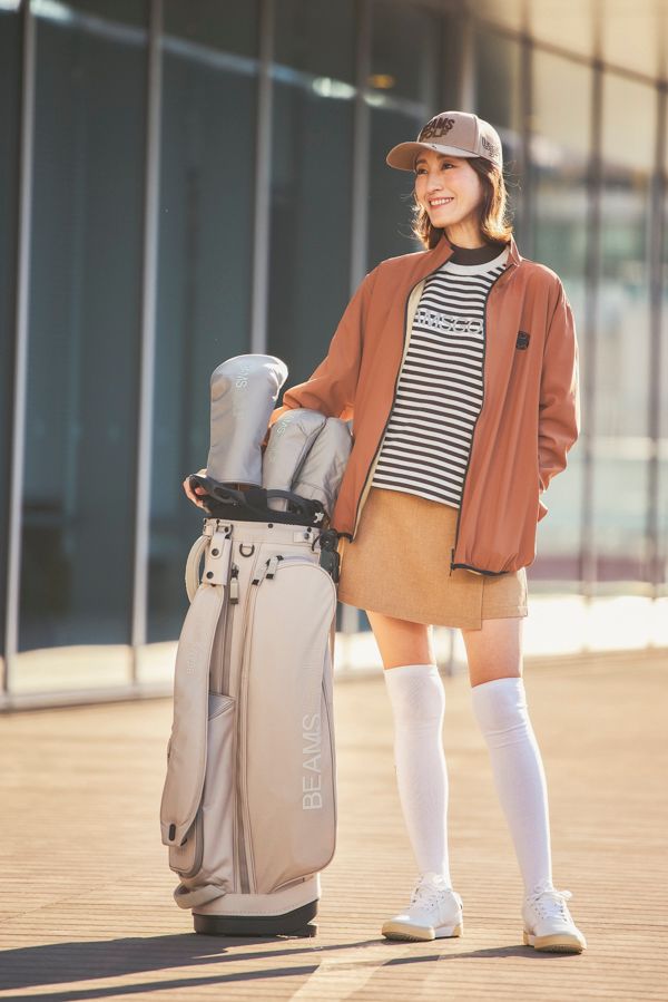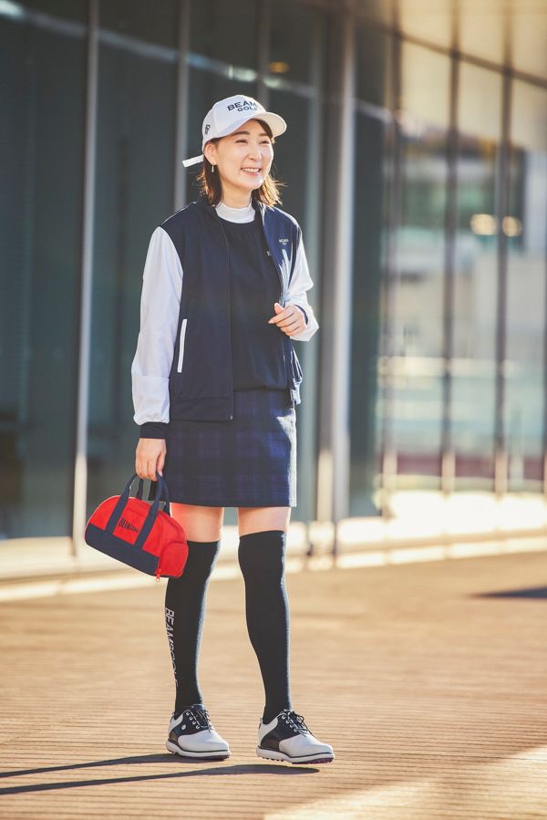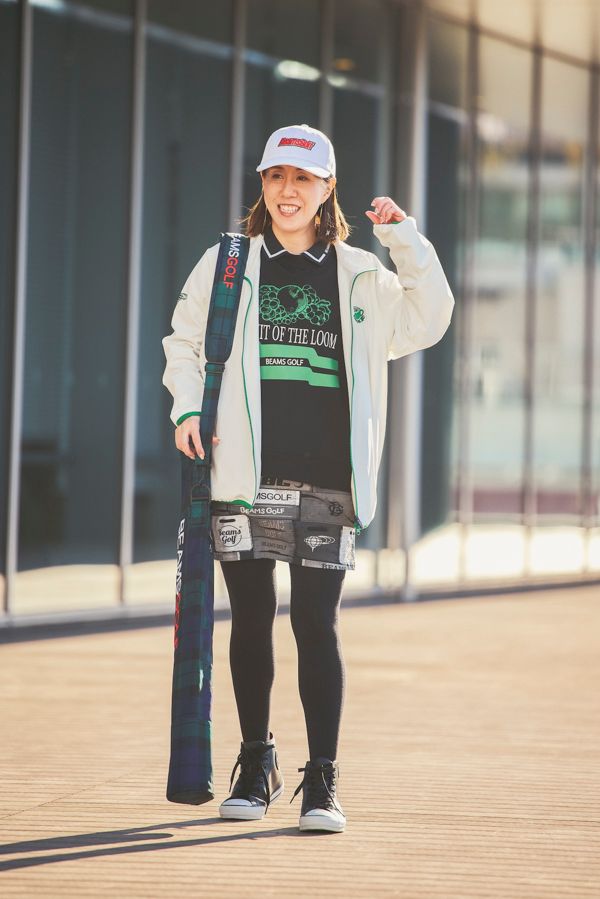 【コーデのポイント】全体的に黒を効かせてメンズっぽくまとめました。ロゴ入りのトレーナーやプリント柄のスカート、ハイカットスニーカーやメンズのブルゾンで街着のようなスタイルにまとまるのはファッション性が高いビームスならではの魅力。ゴルフウェアはコスプレ感覚でいつもの自分じゃないコーデに挑戦できるのも楽しみの一つです。もちろん防寒と機能性はバッチリです。