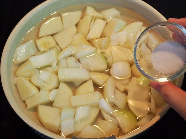 4. フライパンにじゃがいも、玉ねぎ、全体が浸るくらいの水(分量外)を入れる。さらに塩をふり入れフタをして、中火にかける。