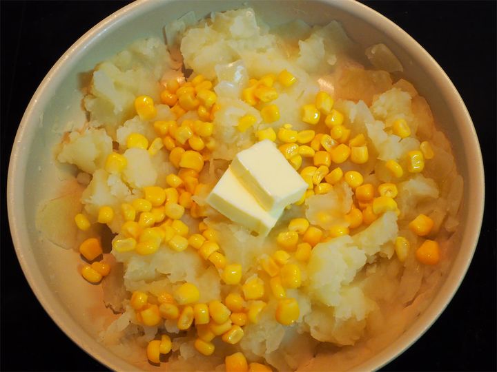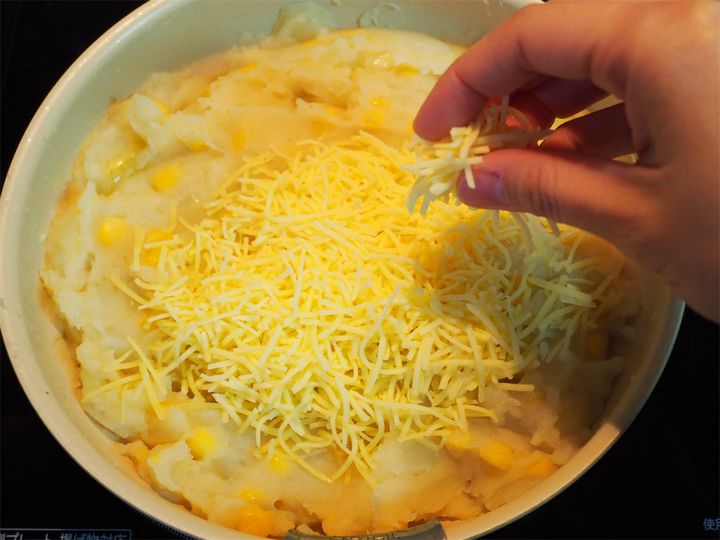 7. 水分が無くなったら全体をつぶし、水切りしたコーン、バター、塩、こしょうを加えて混ぜ合わせる。