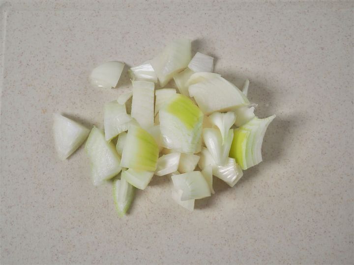 2. 玉ねぎの皮を剥き、ざく切りにする。