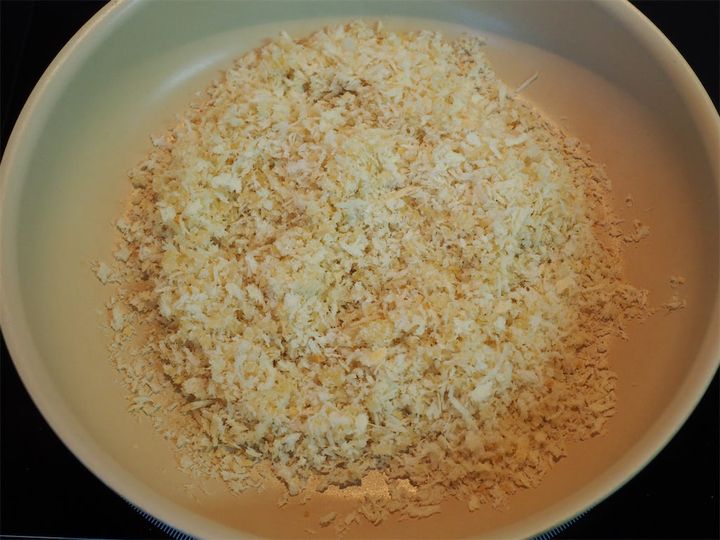 3. フライパンにサラダ油を入れ弱火で熱し、パン粉を加えてきつね色になるまで炒めてバットに取り出しておく。