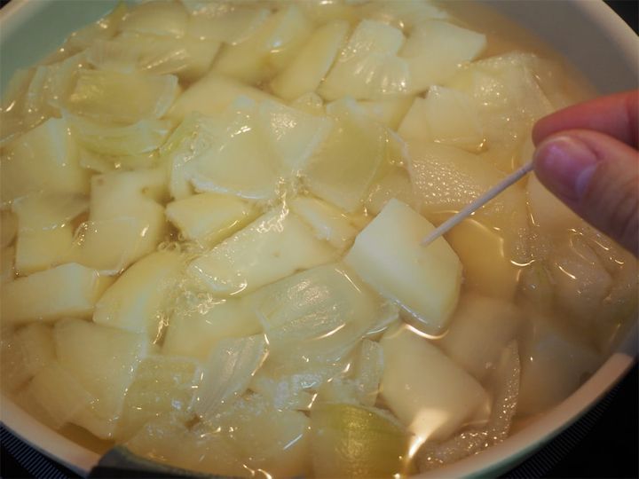 6. じゃがいもが、スッと串が刺さるぐらいまで柔らかくなったらフタをとり、強火で水分が無くなるまで5分ほど加熱する。