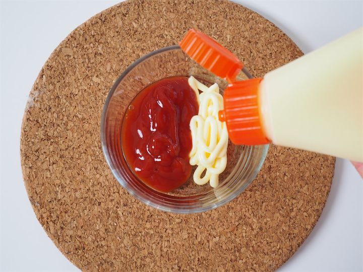 11. お皿に盛り付け、ケチャップとマヨネーズを混ぜ合わせたオーロラソースをかけたら完成。