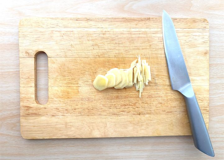 しょうがは皮を剥いて薄くスライスしてから千切りにします。