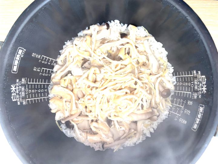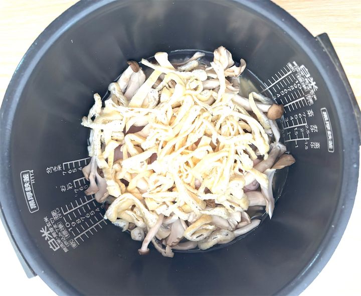 その上から、きのこと1の油揚げを入れたら、炊飯器のフタをして通常炊飯で炊きましょう。