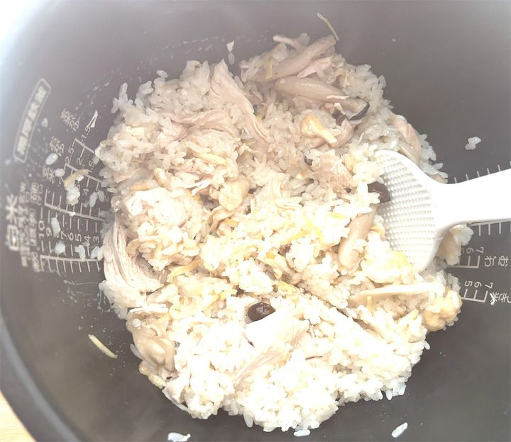 炊き上がったら、鶏肉をほぐしながら全体を混ぜて、茶碗に盛ります。