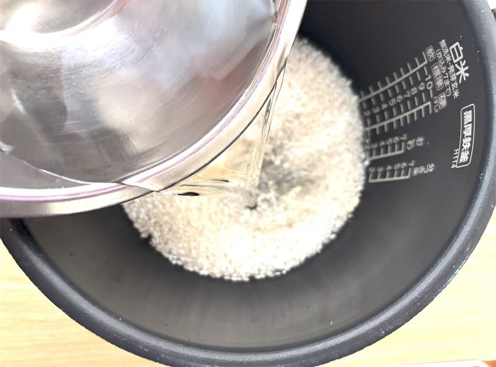次に、冷水を内釜の2合のラインより少しだけ少なめの量で注ぎます。