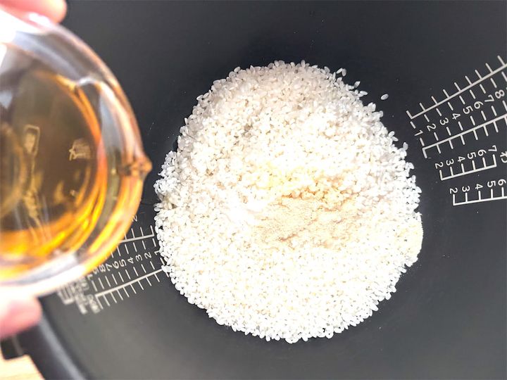 炊飯器の内釜に洗った米を入れたら、鶏がらスープの素、白だし、塩を加えます。