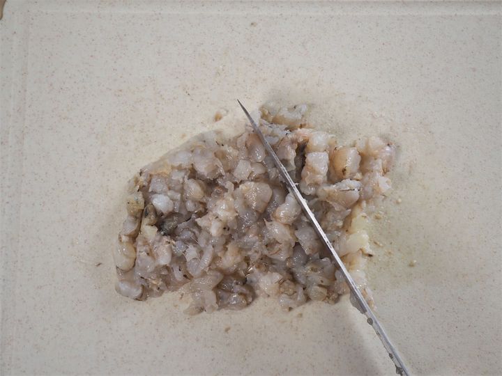 1. エビを細かく刻み、包丁で叩いて粗ミンチ状にする。