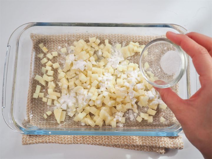 5. バットやお皿に4を入れ、片栗粉(衣用)、塩を加えて全体を混ぜ合わせ、じゃがいもの表面にまぶしていく。